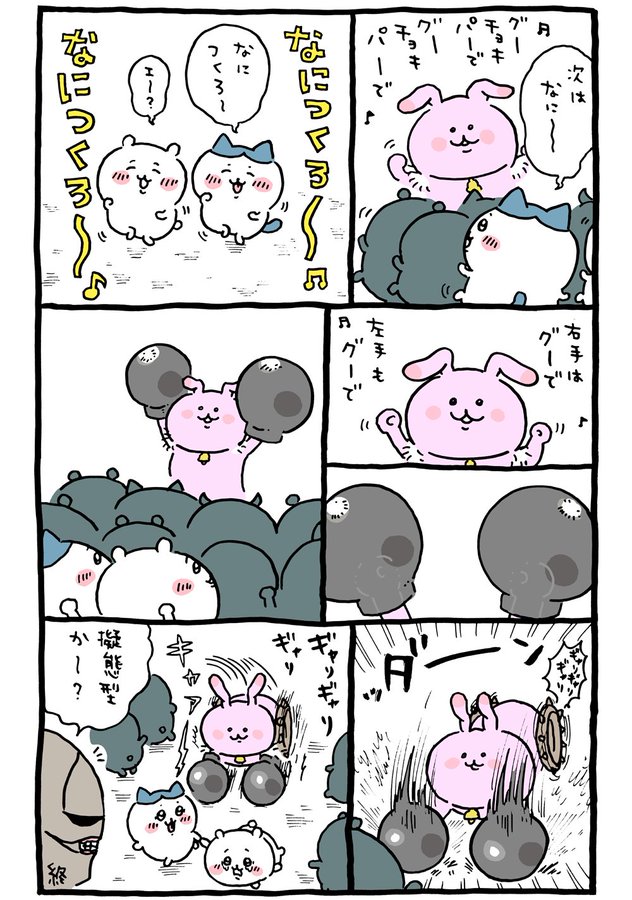 「グーチョキパーで何作ろう?」の歌にのせて、ちいかわ達を呼び寄せ、踊らせて最初は楽しませますが、その後手と足を変形させてちいかわ達を襲ってきました。