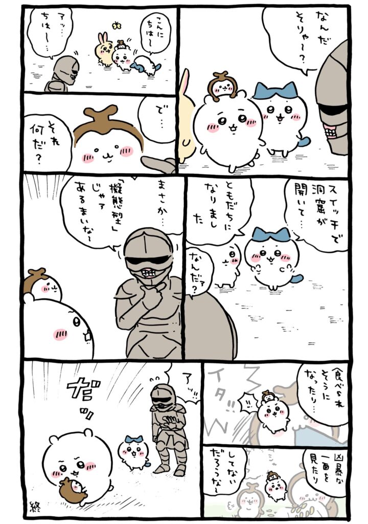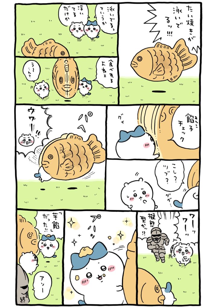 ちいかわとたまたま居合わせた鎧さんが駆け寄りますが、ハチワレは普通に顔を出し「芋餡だった!!」と呑気に返答していました。