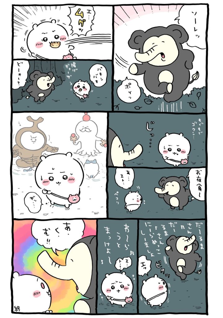 ある日の夜、ちいかわが草むしり検定の勉強をしていたところ、お腹が空き夜食を買いに外に出ると、象(バグ)のような生物に出会いました。