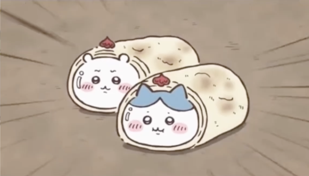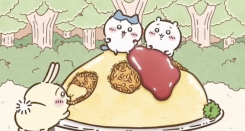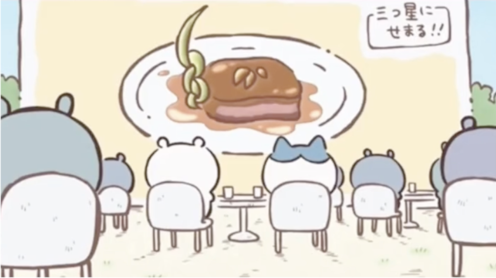 ちいかわの自宅近く付近の大きなモニターがある場所で、焼きそばを食べていたちいかわとハチワレは、モニターに放映される三つ星レストランに興味を持ちます。
