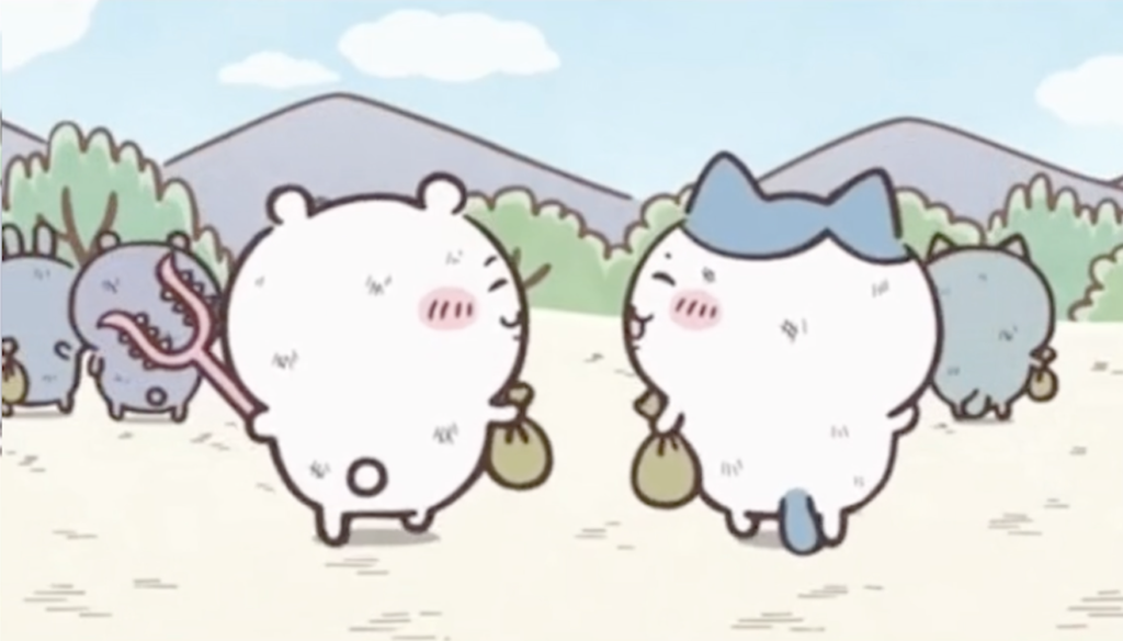 別日に、労働終了後に出会ったちいかわとハチワレは一緒にお昼ご飯を食べようとし、どこかへ歩いていきます。
