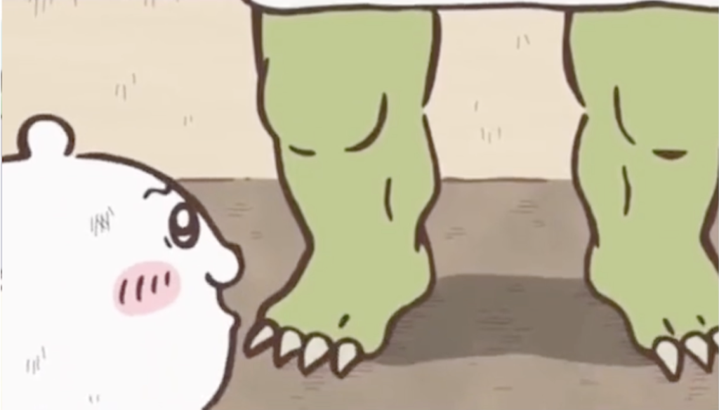 ちいかわ達が、動揺していたところ、ちいかわが大きな指で背後をつつかれます。
