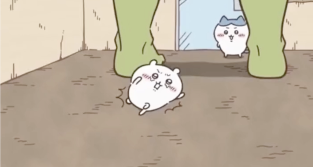 店主はちいかわ達よりかなり大きく、よく無事に逃げることができたと思います。作中の中でもかなり大型のキャラクターです。