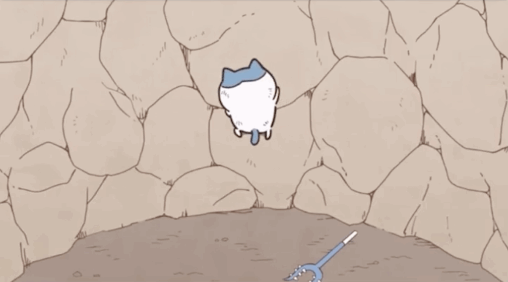 ちいかわのピンチに気付き、躊躇なく崖から飛び降りています。彼も勇敢な面を持っています。